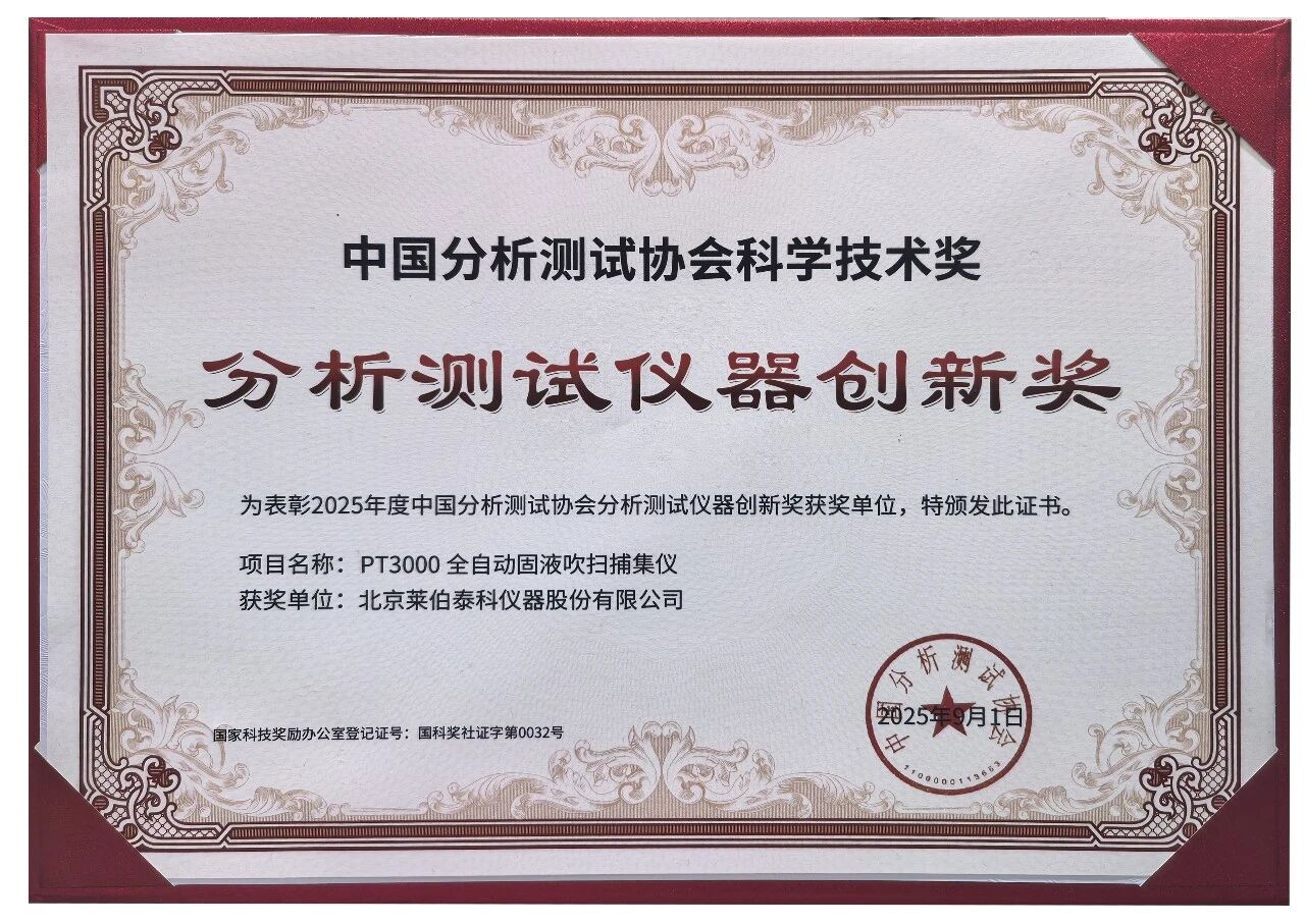 近日,萊伯泰科自主研發(fā)生產(chǎn)的PT3000全自動固液吹掃捕集儀,成功斬獲由中國分析測試協(xié)會頒發(fā)的“分析測試儀器創(chuàng)新獎”(原BCEIA金獎)!這一獎項(xiàng)經(jīng)國家科技獎勵辦公室備案,是我國分析測試領(lǐng)域技術(shù)創(chuàng)新成果的核心認(rèn)可標(biāo)志,代表著該領(lǐng)域技術(shù)研發(fā)的高水平方向。此次獲獎,不僅是對PT3000儀器性能的高度肯定,更彰顯了萊伯泰科在實(shí)驗(yàn)室分析儀器領(lǐng)域的硬核技術(shù)實(shí)力。